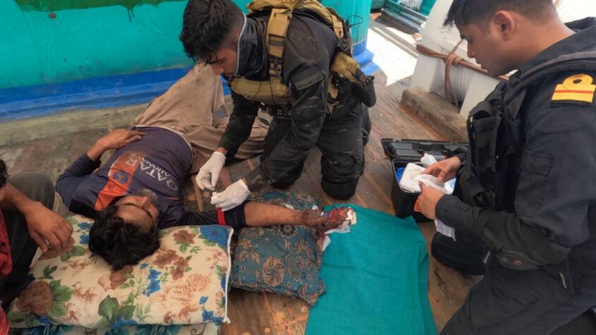 The Medical Officer of INS Trikand, along with a team comprising MARCOS (Marine Commandos) and the Ship’s Boarding Team, boarded the FV to administer aid. After providing local anesthesia, the Ship’s Medical Team performed suturing and splinting on the injured fingers. The surgical procedure which lasted for over three hours, was successfully completed, and bleeding was controlled in time, thereby preventing potential permanent loss of the injured fingers due to gangrene.