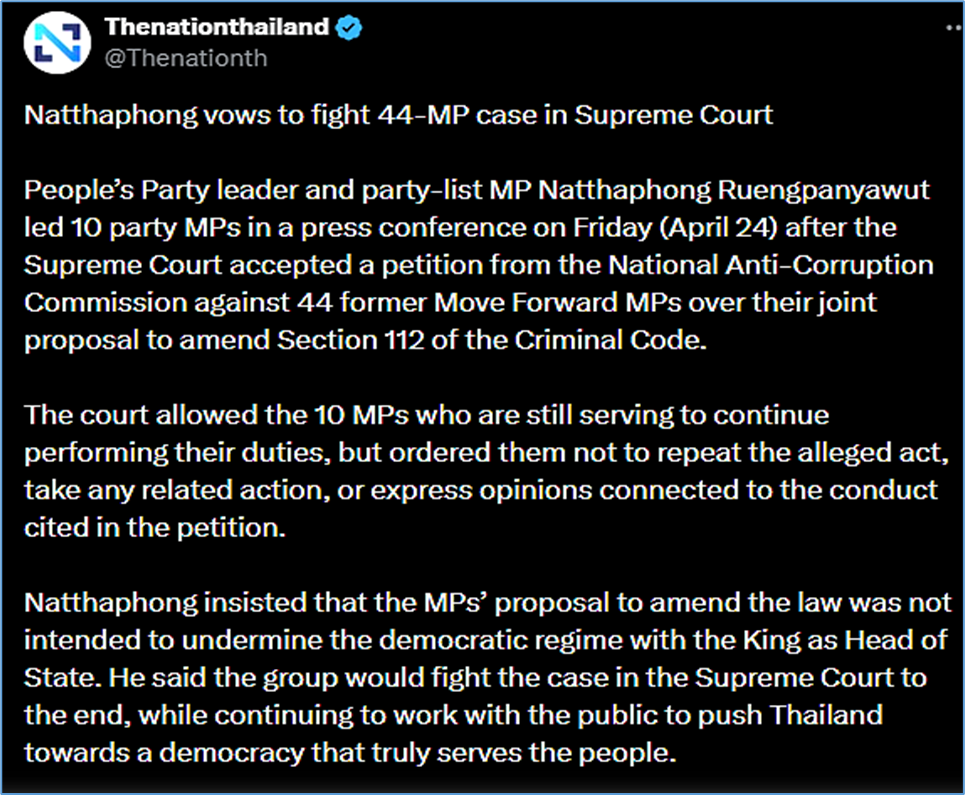 In a press conference following the court’s decision, People’s Party leader Natthaphong insisted that the MPs’ proposal to amend the law was not intended to undermine the democratic regime with the King as Head of State. He said the group would fight the case in the Supreme Court to the end, while continuing to work with the public to push Thailand towards a democracy that truly serves the people.