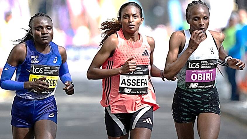 In the closing stages, Assefa gradually edged clear to secure victory in 2:15:41, taking nine seconds off her own global mark. Behind her, Obiri, who made her London debut has finished second in a PB of 2:15:53, with Jepkosgei close behind in 2:15:55, marking the first time three women have finished inside 2:16 in the same race.