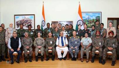 Raksha Mantri interacts with global women peacekeepers taking part in UN Women Military Officers Course 2025 in New Delhi