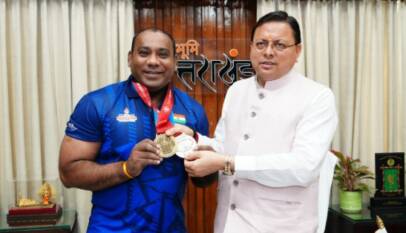Chief Minister Pushkar Singh Dhami Meets Powerlifter Mukesh Pal at Camp Office