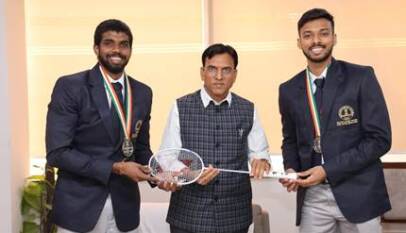 Olympians Satwik-Chirag receive Major Dhyan Chand Khel Ratna Award from Union Minister Dr Mansukh Mandaviya
