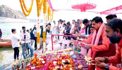 CM Dr. Yadav prays for the prosperity of the state by performing worship ritual to Maa Narmada in Omkareshwar