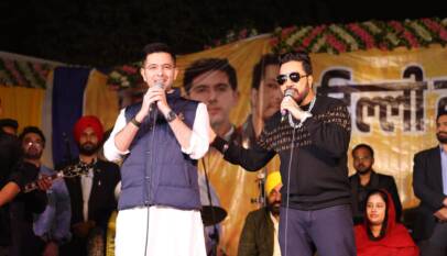 Singer Mika Singh and MP Raghav Chadha perform together on election stage, crowd cheers