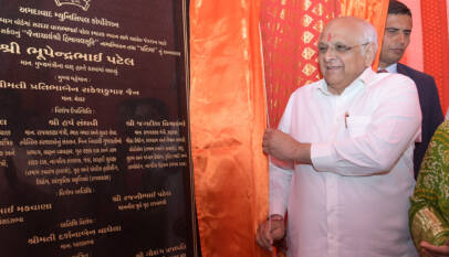 CM Bhupendra Patel unveils the statue of Jainacharya Shri Himachalsuriji near the Sardar Patel Memorial Building