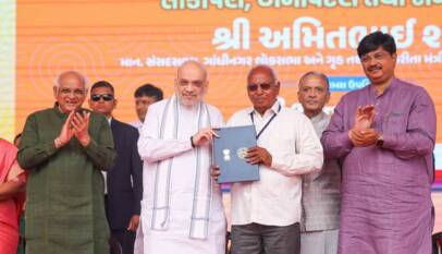Amit Shah distributes land allotment certificates to 205 families of Nava Vanjar village in Ahmedabad, Gujarat