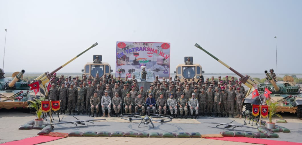 Shri Rajesh Kumar Singh witnessed the multi-agency capability Exercise ‘TATRAKSHA’, showcasing seamless integration of the Indian Army, Indian Navy, Indian Air Force, Indian Coast Guard, BSF, and allied security agencies in coastal and amphibious operations. The exercise displayed real time surveillance, precision strikes, joint logistics and rapid response capabilities to handle emerging maritime and border threats, validating decisive integrated capability for a full spectrum of operations.