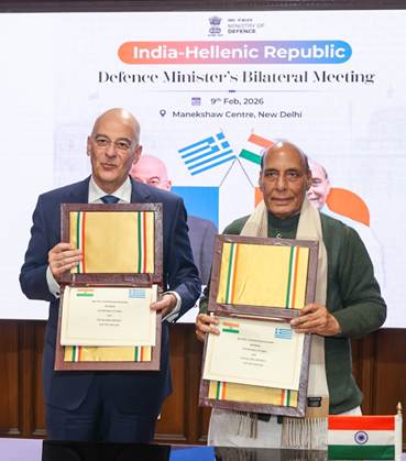 Raksha Mantri Shri Rajnath Singh held a bilateral meeting with Minister of the National Defence of the Hellenic Republic Mr Nikolaos-Georgios Dendias in New Delhi on February 09, 2026. Both Ministers reiterated that the India-Greece Strategic Partnership is based on shared values of peace, stability, freedom, and mutual respect.
