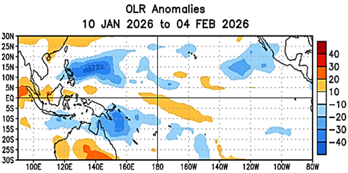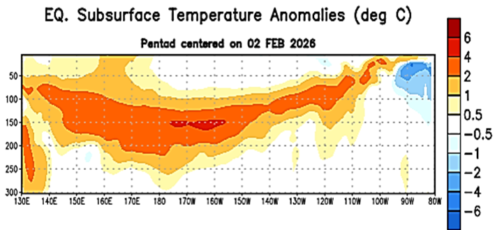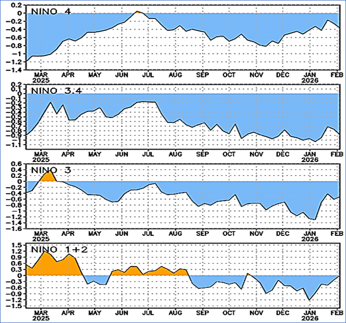 The traditional and equatorial Southern Oscillation indices were positive. Collectively, the coupled ocean-atmosphere system remained consistent with La Niña. The North American Multi-Model Ensemble (NMME) average, including the NCEP CFSv2, favour the onset of ENSO-neutral in February-April 2026.
