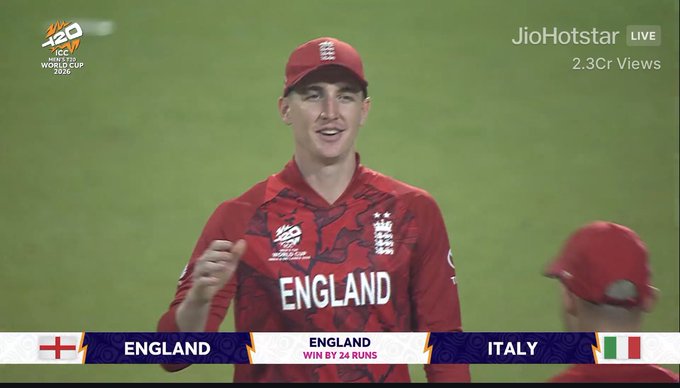 Kolkata, Feb 2026 : England booked their place in the Super 8s of the ICC Men’s T20 World Cup with a tense 24-run victory over Italy in a pulsating Group C encounter at Eden Gardens, Kolkata. What looked, at one stage, like a comfortable night for the defending champions turned into a stern test of temperament as Italy, led by a breathtaking counterattack from Ben Manenti and Grant Stewart, pushed England to the brink before experience finally told.