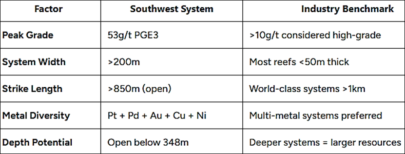 Terra Metals’ Southwest discovery exhibits characteristics consistent with world-class PGM sulfide systems. The combination of exceptional grades (up to 1 oz/t PGE3), substantial widths (>200m mineralised thickness), and system scale (>850m strike length) positions this as a potentially globally significant discovery.