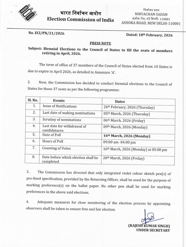 New Delhi, February 2026 : The Election Commission of India has announced the schedule for the biennial elections to fill 37 vacancies in the Rajya Sabha, including seven seats from Maharashtra. Voting for these vacancies will be held on March 16, 2026.