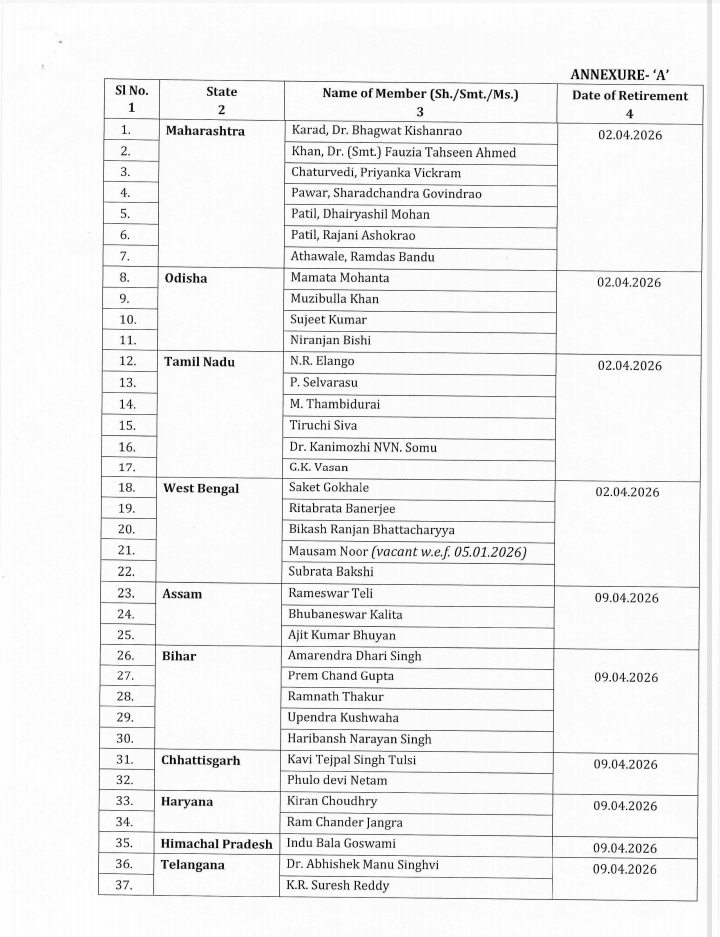 The terms of seven Rajya Sabha members from Maharashtra—Bhagwat Kishanrao Karad, Fauzia Tahseen Ahmed Khan, Priyanka Vikram Chaturvedi, Sharadchandra Govindrao Pawar, Dhairyasheel Mohan Patil, Rajni Ashokrao Patil, and Ramdas Athawale—will end on April 2.