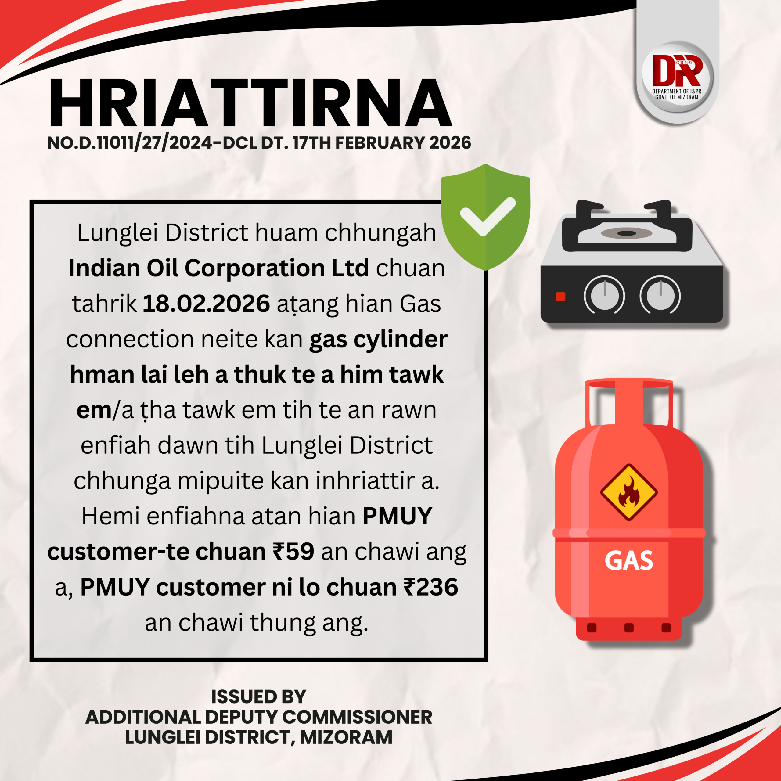 Lunglei, February 2026: The Additional Deputy Commissioner of Lunglei District, Ms. Zoramdini, has issued a notice informing that the Indian Oil Corporation Limited (IOCL) will conduct inspections of gas cylinders in use and their related accessories within Lunglei District starting from February 18, 2026.