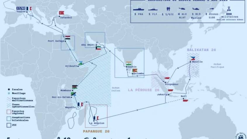 The itinerary itself reads like a checklist of contemporary maritime friction points and partnership priorities. After transiting the Suez Canal, the group makes an early stop at Port Safaga, with bilateral activity in the Red Sea, before port visits to Mombasa and Dar es Salaam and sovereignty-oriented activity around Mayotte, followed by Réunion and the regional exercise Papangue 26. The deployment then pushes east through Indonesia with split port calls, reaches the Philippines for Balikatan 2026 and Manila, and later folds into Singapore and the French-led La Perouse 2026 exercise, before continuing via Colombo and Kochi, then Abu Dhabi and Djibouti, and returning to the Mediterranean with a final Istanbul call ahead of a mid-July return to Toulon.