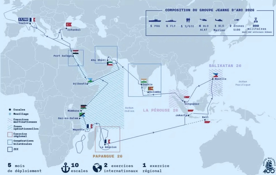 Paris; February 2026: The French Ministry of the Armed Forces and the Marine Nationale has confirmed on February 19th 2026, that the Jeanne d’Arc 2026 task group has sailed from Toulon for a five-month deployment stretching from the Mediterranean into the Red Sea, East Africa, the Indian Ocean, and onward to the Indo-Pacific. Built around the Mistral-class amphibious assault ship Dixmude (L9015) and escorted by the La Fayette-class stealth frigate Aconit (F713), the mission blends the traditional formation of naval officers with a more pointed operational signal: France is rehearsing joint power projection under the same maritime security pressures that now define key sea lanes across three continents.