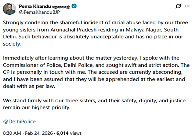New Delhi; February 2026: Arunachal Pradesh Chief Minister Pema Khandu today morning have strongly condemned the racial abuse of three women from the state residing in South Delhi’s Malviya Nagar. Taking cognizance of the matter, the Chief Minister confirmed that he has personally spoken with the Delhi Police Commissioner to ensure the immediate arrest of the accused individuals who are currently on the run.