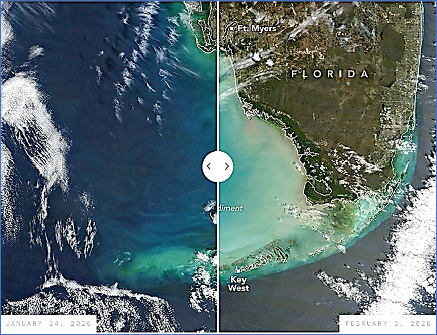 On 03rd February 2026, the MODIS (Moderate Resolution Imaging Spectroradiometer) on NASA’s Terra satellite captured this image (right) of brightened waters over the West Florida Shelf, a broad and shallow continental shelf region known as a carbonate ramp. The blue color comes from suspended calcium carbonate (CaCO3) mud, which consists primarily of remnants of marine organisms that live on the shelf. For comparison, the left image shows the area on January 24, before the cold air arrived.