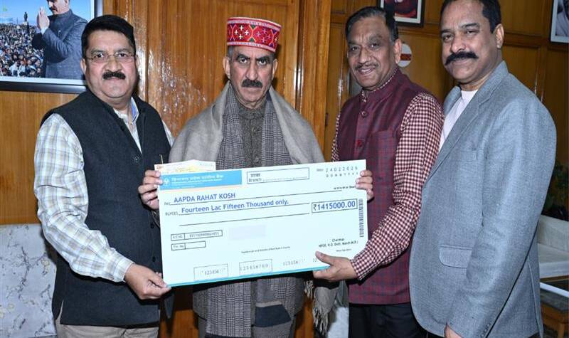 Chairman Himachal Pradesh Grameen Bank Rajinder Singh presented a cheque of Rs. 14.15 lakh to Chief Minister Thakur Sukhvinder Singh Sukhu here today as one day salary of the employees of the bank towards Aapada Rahat Kosh. Earlier, the Bank had also contributed Rs. 19.80 lakh towards this Kosh.