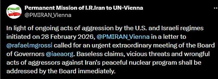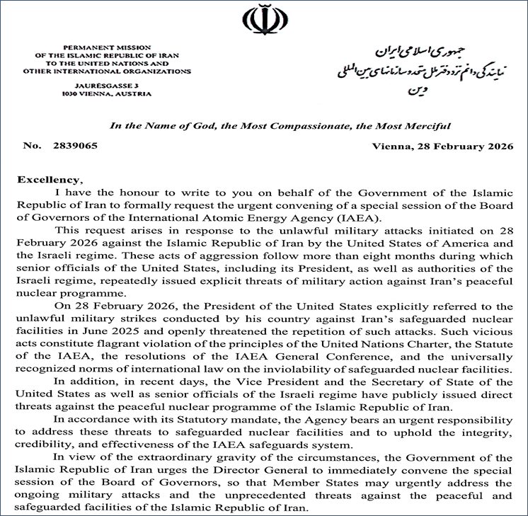 Tehran; February 2026: Iran’s Permanent Mission to the United Nations and other International Organisations in Vienna sent a letter today, 28th February 2026, to the Director General Rafael Grossi of International Atomic Energy Agency (IAEA) asking for an urgent emergency meeting of the group’s Board of Directors.