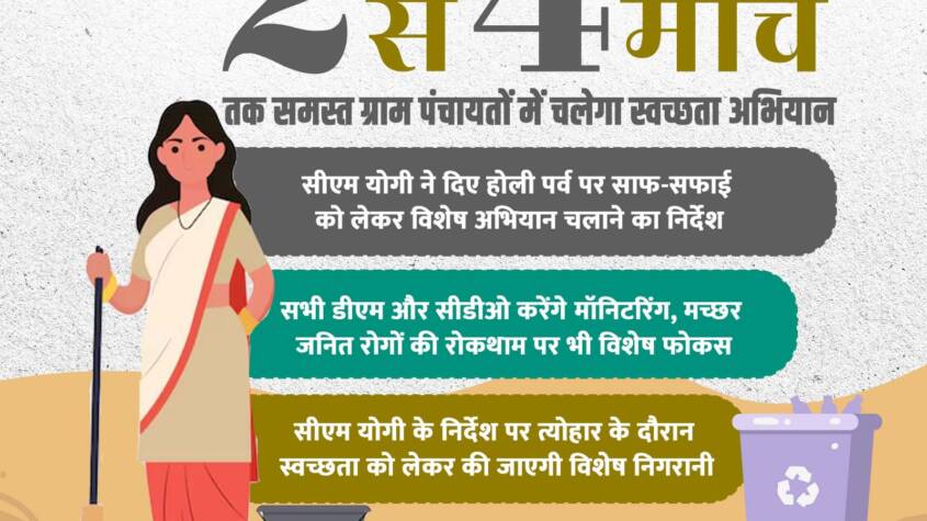 Lucknow, March 2026 : In view of the upcoming Holi festival, Chief Minister Yogi Adityanath has directed officials to ensure comprehensive sanitation measures and effective prevention of mosquito-borne diseases in rural areas. Under these instructions, an extensive cleanliness and sanitization drive will be carried out in all Gram Panchayats across the state from March 2 to 4. The Chief Minister has asked officials to maintain special vigilance over sanitation arrangements during the festival. All District Magistrates and Chief Development Officers will monitor the campaign.