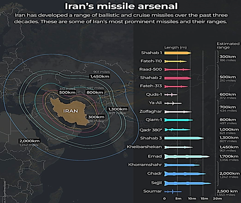 These medium-range missiles place Israel and a wide arc of US-linked facilities in Qatar, Bahrain, Kuwait, Saudi Arabia and the United Arab Emirates within range, widening both Iran’s target list and the region’s exposure.