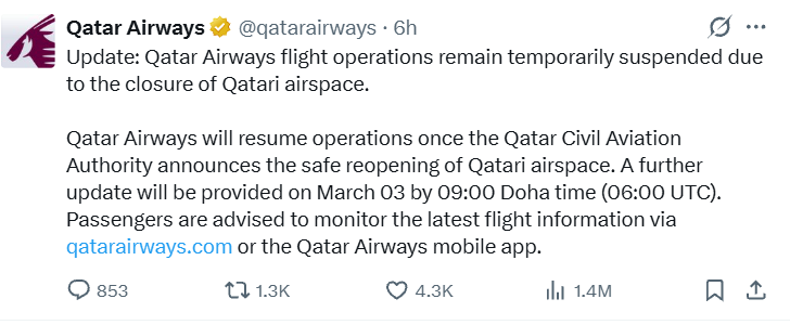 In a statement posted on X, Qatar Airways said its operations would restart only after the Qatar Civil Aviation Authority announces the safe reopening of national airspace. The airline added that a further update would be issued by March 3 at 09:00 Doha time. Passengers were advised to closely monitor flight status updates through the official Qatar Airways website and mobile application.