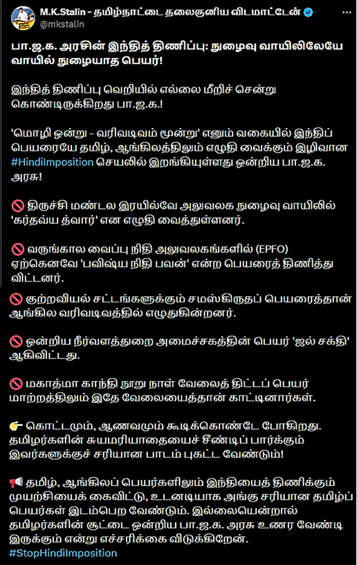“Hindi Imposition by the BJP Government: Unpronounceable names at the very entrance! The BJP is crossing all limits in its obsession with Hindi imposition! The Union BJP government has engaged in the vile act of #HindiImposition by adopting a “one language, three scripts” approach, where Hindi names