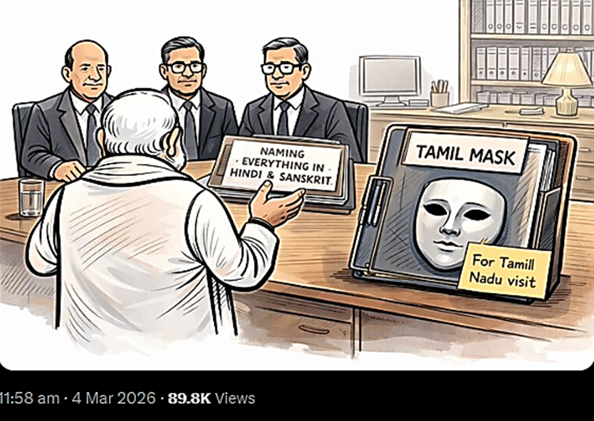 Tamil Nadu; March 2026: Tamil Nadu Chief Minister MK Stalin on Wednesday again accused the Central government of “imposing Hindi” in the state, this time under the guise of the “one language, three scripts” approach. Stalin alleged that the Bharatiya Janata Party-led Central government is simply transliterating “unpronounceable” Hindi names in English and Tamil scripts, warning the BJP against its “obsession” with Hindi imposition.