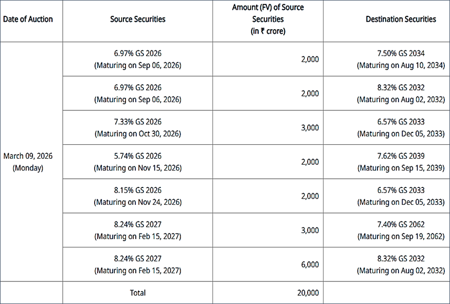 Mumbai; March 2026: Government of India announces the conversion/switch of its securities through auction for an aggregate amount of ₹20,000 crore (face value). The security-wise details of the conversion/switch are given as under: