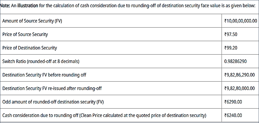 14. The amount of destination security to be issued for each successful bid will be computed by multiplying the allotted amount (FV) of the source security with the rounded-off switch ratio. The amount of destination security (FV) would be rounded-off to the nearest lower value in multiples of ₹10,000.
