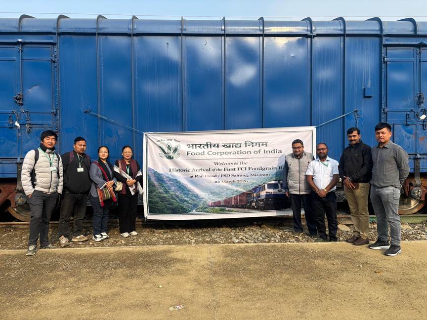 In a significant historic milestone, the first-ever Food Corporation of India (FCI) food grain cargo train arrived at Sairang Railway Station on 3rd March, 2026. The cargo train comprised 42 wagons carrying around 25,900 quintals of rice from Punjab. This marks an important step in strengthening rail-based freight connectivity in the state and improving the supply chain of essential commodities. The successful unloading of the inward FCI food grain rake at Sairang signifies the growing operational capability of the station and highlights the expanding role of railway infrastructure in supporting Mizoram’s logistics and food distribution network.