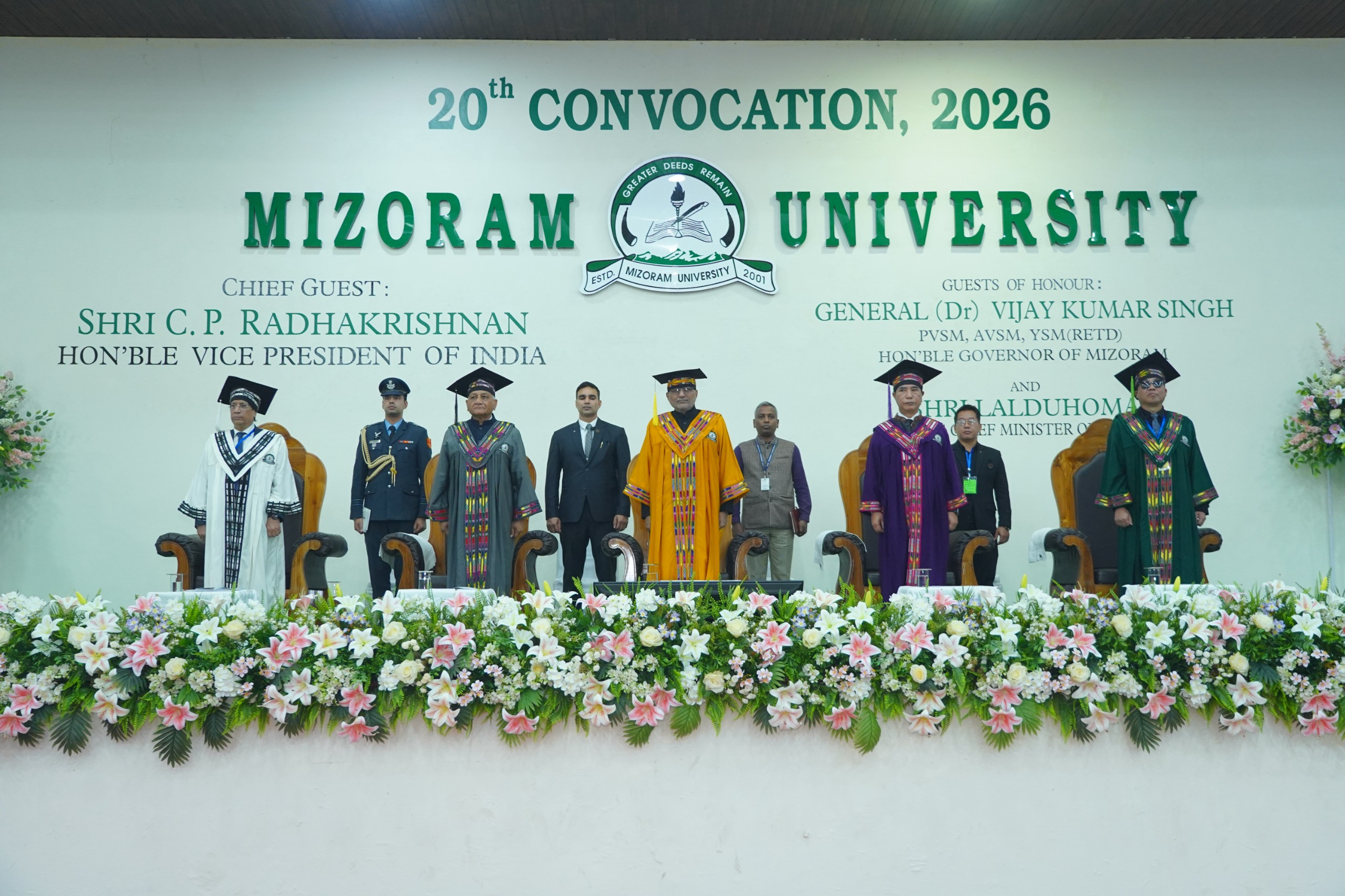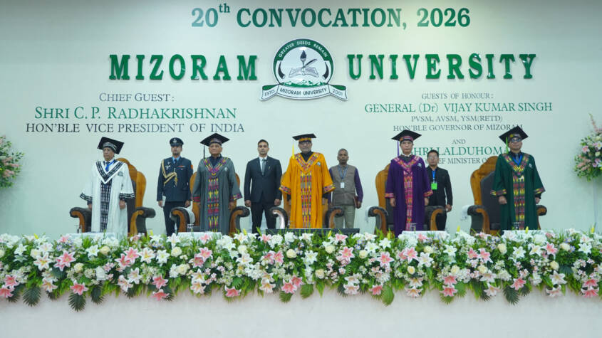 Aizawl, March, 2026: Vice President of India Shri C.P. Radhakrishnan today graced the 20th Convocation of Mizoram University (MZU) as the Chief Guest. The ceremony was held at the Multipurpose Hall on the MZU campus in Tanhril, Aizawl. The event was also attended by the Governor of Mizoram and Chief Rector of Mizoram University, General (Dr) Vijay Kumar Singh (Retd), PVSM, AVSM, YSM, along with Chief Minister Pu Lalduhoma, who served as Guests of Honour.