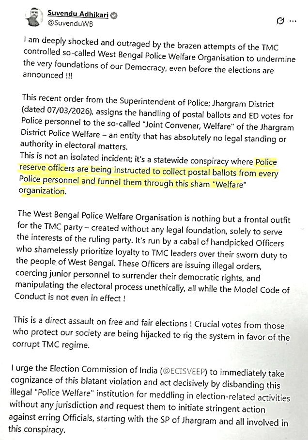 The clarification comes after Leader of Opposition in West Bengal Assembly Suvendu Adhikari alleged that the Trinamool Congress government was attempting to manipulate the electoral process by instructing police officers to collect postal ballots through a police welfare organisation. Adhikari had urged the Election Commission to intervene, calling the alleged move a “direct assault on free and fair elections” and demanding action against officials involved in handling postal ballots outside authorised channels.