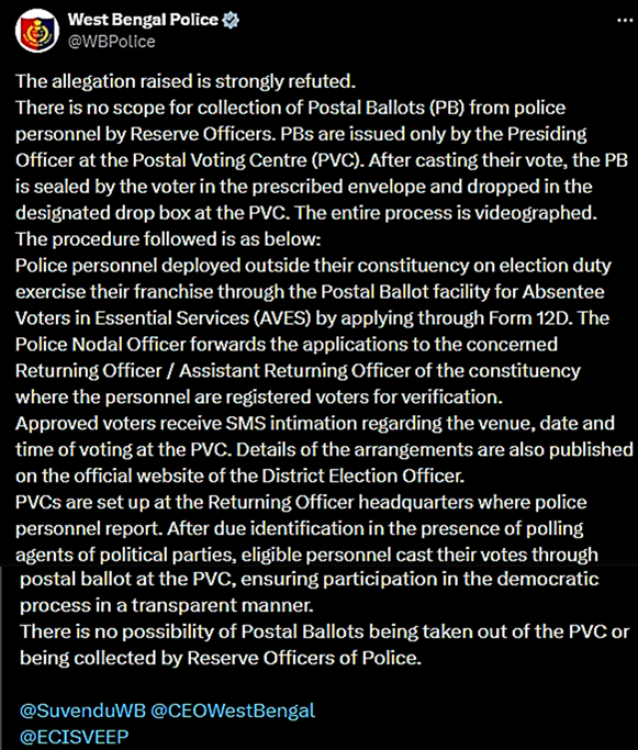 In a post on X responding to Adhikari’s claims, the police clarified that postal ballots cannot be collected by reserve officers and are issued only through authorised election officials at designated centres. “The allegation raised is strongly refuted. There is no scope for the collection of Postal Ballots (PB) from police personnel by Reserve Officers. PBs are issued only by the Presiding Officer at the Postal Voting Centre (PVC)”, West Bengal Police said.