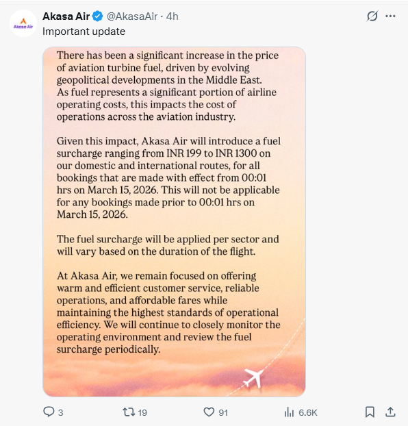 “Given this impact, Akasa Air will introduce a fuel surcharge ranging from ₹199 to ₹1,300 on our domestic and international routes for all bookings made with effect from 00:01 hours on March 15, 2026,” the airline said in its statement.