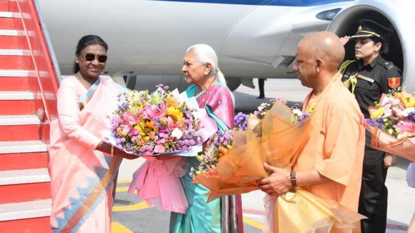 Ayodhya, March 2026 : On the first day of Chaitra Navratri, Thursday, President Droupadi Murmu arrived in Ram Nagari. She received a grand welcome here. Her arrival in Ayodhya was marked by historical and cultural dignity. At Maharishi Valmiki International Airport, Governor Anandiben Patel and Chief Minister Yogi Adityanath welcomed her by presenting bouquets. During this, Deputy Chief Ministers Keshav Prasad Maurya and Brajesh Pathak were also present.