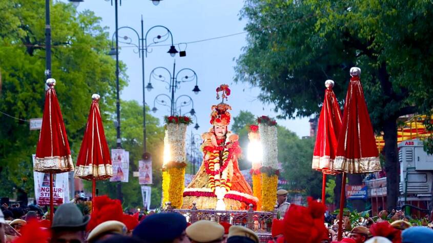 From Tripolia Gate to Chhoti Chaupar and Gangauri Bazaar, people lined rooftops, balconies, and streets, showering flowers on the grand procession.