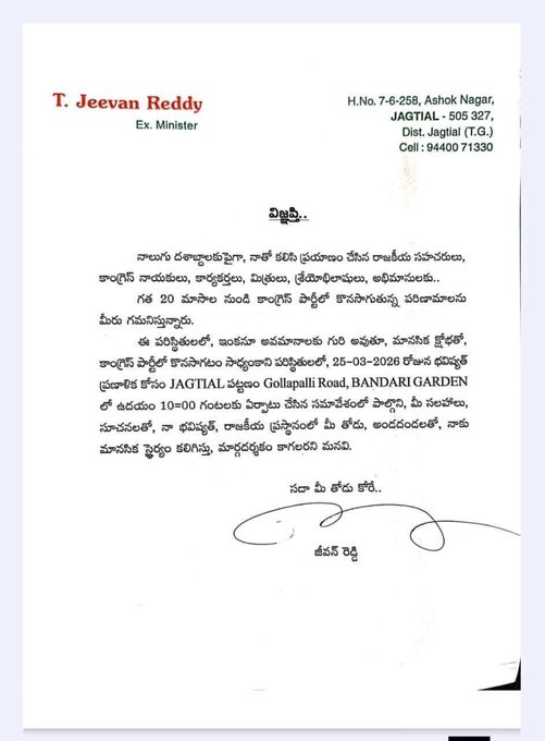In an open letter addressed to party workers, Jeevan Reddy expressed anguish over what he described as insults and mental distress within the party. He invited party members to a meeting scheduled in Jagtial on March 25 to discuss the future course of action, signalling that his next move may depend on feedback from grassroots supporters.