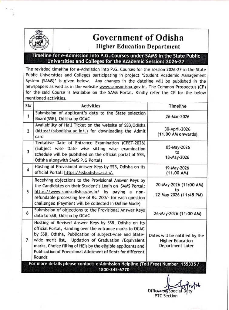 Bhubaneswar, March, 2026 : The Common PG Entrance Test (CPET) 2026 is set to commence from 5th May, 2026, as per the notification issued by the Higher Education Department. The entrance examination will be conducted from 5th May to 18th May, 2026.