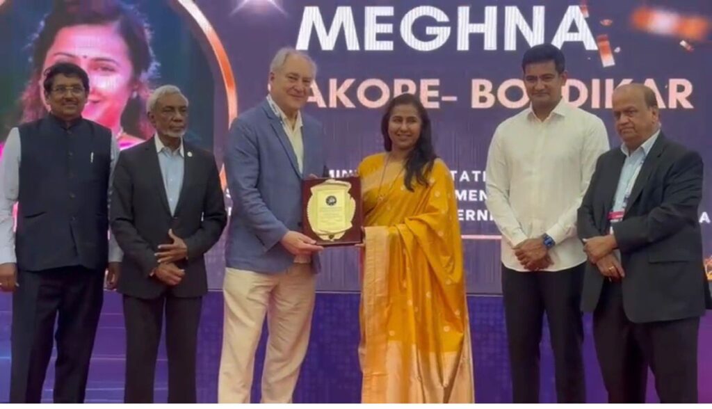 Mumbai, March 2026: Minister of State Meghna Sakore-Bordikar has been honoured with the prestigious international “Outstanding Visionary Leader and True Changemaker” award by the US India SME Council. The award was presented at a grand ceremony held at Bharat Mandapam in New Delhi on March 25, 2026.