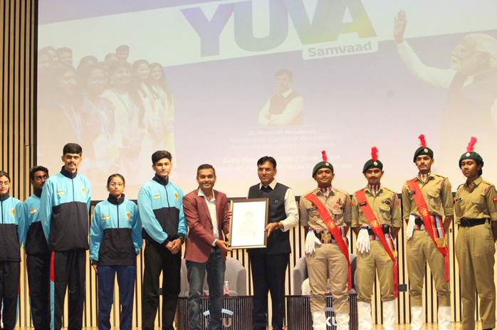 A dynamic and engaging session of Viksit Bharat Yuva Samvaad was organised at RK University, Rajkot, witnessing enthusiastic participation from over 1000 students. The event was graced by the Hon’ble Union Minister of Youth Affairs & Sports and Labour & Employment Dr. Mansukh Mandaviya as the Chief Guest, who inspired yuva shakti to take charge of India’s development journey.
