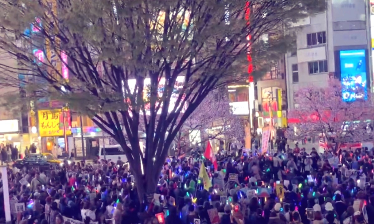 Some demonstrators also gathered under the cherry blossoms at the Shinjuku Station Southeast Exit Plaza and their voices rose together in a powerful finale, with the chorus of Japanese version of “Do you hear the people sing” echoing through the plaza, according to a video of the gathering posted by @asaoka_akiko.