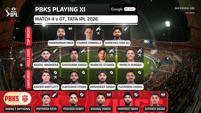Playing XIs: Punjab Kings: Prabhsimran Singh (wk), Cooper Connolly, Shreyas Iyer (c), Nehal Wadhera, Shashank Singh, Marcus Stoinis, Marco Jansen, Xavier Bartlett, Vijaykumar Vyshak, Arshdeep Singh, Yuzvendra Chahal Impact