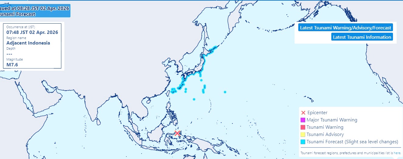 The Japan Meteorological Agency issued a “tsunami forecast” warning of slight sea level changes for the nation’s Pacific coast, but this alert level does not predict damage in the nation. At the same time, the United States authorities had issued a tsunami warning for the coast of Indonesia, with smaller waves possible in other areas including Japan, but the alert was lifted later in the morning.