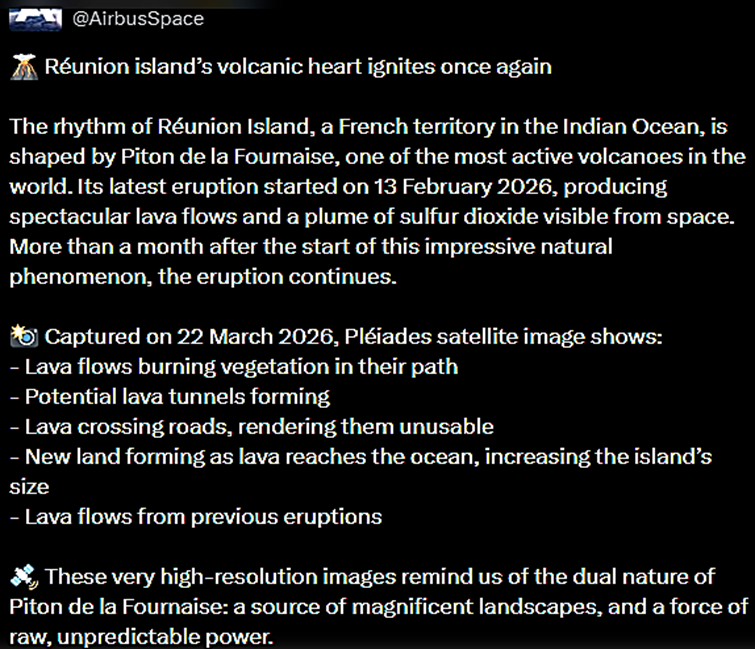 Since the 17th century, the volcano has had more than 150 documented eruptions. The most recent began within the Enclos Fouqué caldera on February 13, 2026, with the opening of four fissures that fueled sustained lava fountains reaching 10 to 50 meters (30 to 160 feet). Throughout February and March, basaltic lava spilled down the volcano, advancing through forested and grassy areas toward its eastern side.