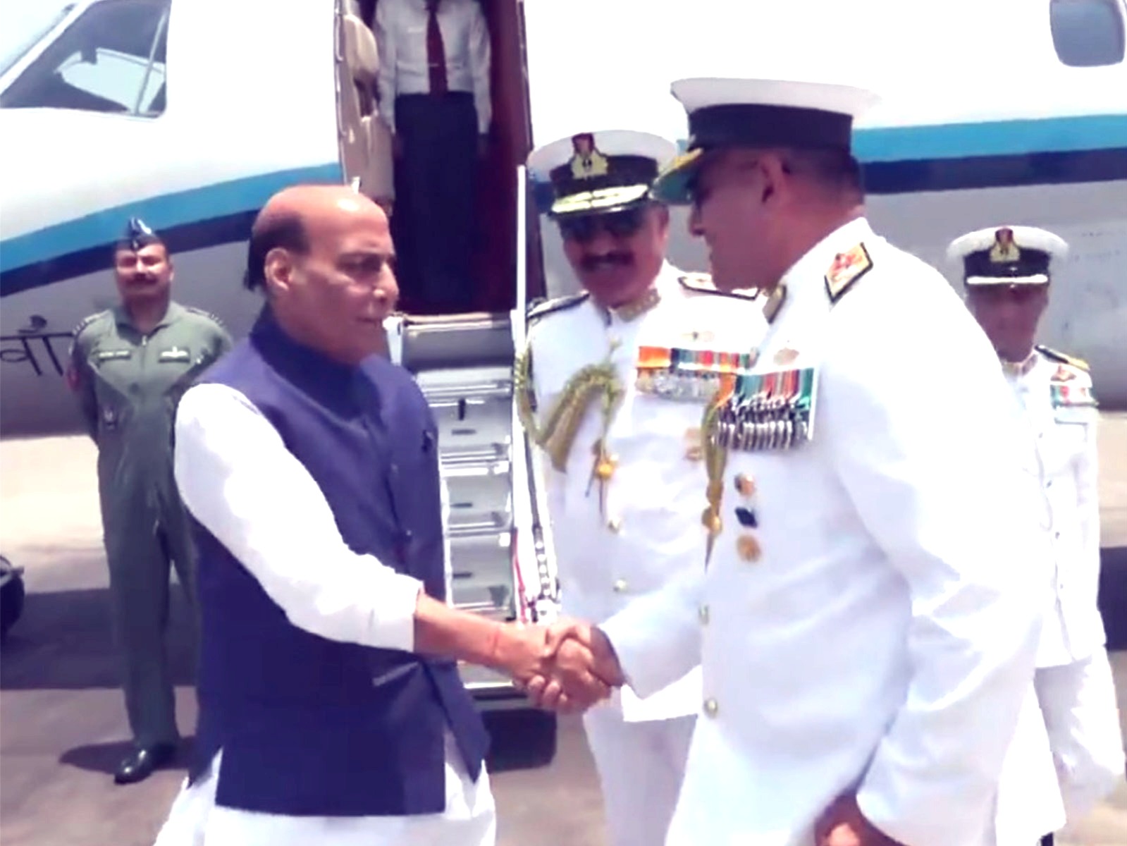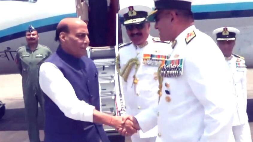 Visakhapatnam; April 2026: Defence Minister Rajnath Singh today landed in Visakhapatnam to attend the commissioning ceremony of INS Taragiri and Aridhaman The Defence Minister was welcomed by Indian Navy chief Admiral Dinesh Kumar Tripathi.