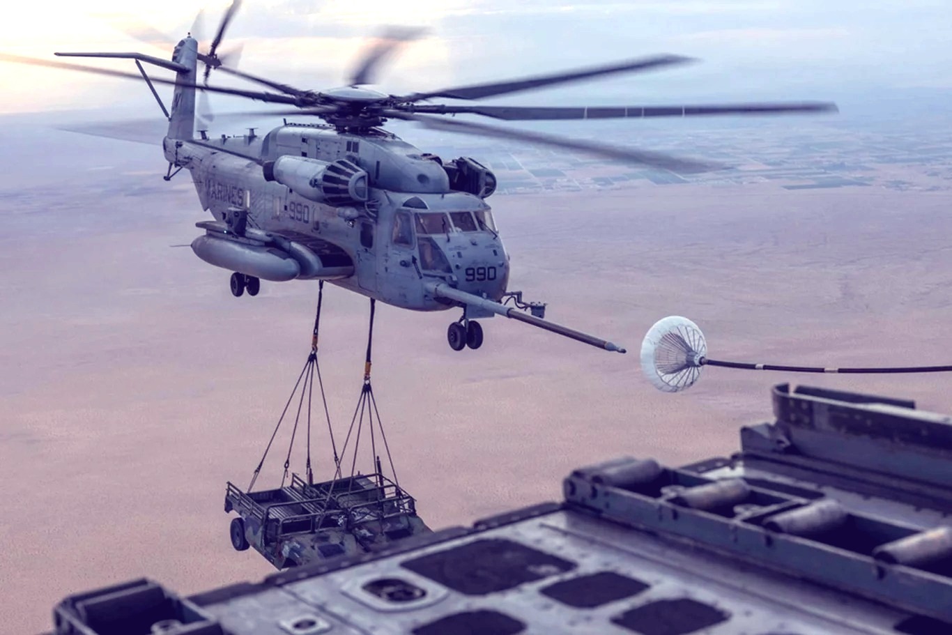 Air-to-air refuelling is what turns that heavy-lift function from a local shuttle into a theater-scale manoeuvre tool. The CH-53E’s refuelling probe gives it effectively open-ended operational reach when tanker support is available. Doing that while carrying two vehicles is especially demanding because the crew must manage power margins, drogue closure, formation discipline, fuel transfer, and external-load behaviour at the same time. Every variable becomes more sensitive when the helicopter is heavy and the sling loads add drag, oscillation risk, and handling penalties. Yet the payoff is considerable. Heavy equipment can be repositioned much farther inland without stopping at exposed forward refuelling points that might themselves become targets. In a contested theater, that reduces dependence on fixed infrastructure and allows forces to sustain manoeuvre even when traditional ground supply routes are under threat.