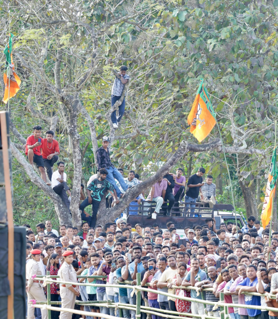 There was tremendous enthusiasm among the public in Assam for CM Yogi. A huge crowd gathered at the Barchala rally, with many youths climbing trees and vehicles just to catch a glimpse of him. CM Yogi greeted the crowd by waving, amid chants of slogans in his support.
