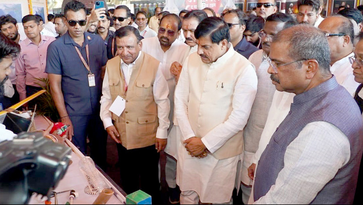 Institutions including ISRO, the Madhya Pradesh Council of Science and Technology, IIT Indore, RRCAT, National Sanskrit University, and the Samrat Vikramaditya Research Peeth showcased their models and research. The Indian Knowledge Systems stall showcased ancient Indian texts, while models of ASLV, Mangalyaan, and Chandrayaan, along with medical, agriculture, and air-taxi drones, attracted special attention.